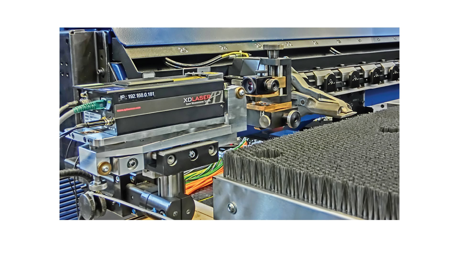 The Trumpf TruMatic 7000 punch laser machine is a marvel of modern manufacturing, processing steel plates weighing nearly 400 Kg throughout the apparatus in an apparently seamless manner. One incorrect position in the punching sequence and the entire plate becomes scrap. Maintaining accuracy is vital, yet the process used to be complicated and time-consuming. The crossbeam extends more than 6m. The tolerances required in measurements on the crossbeam are less than one-hundredth of a millimeter. The process required a combination of different measuring instruments and setups.