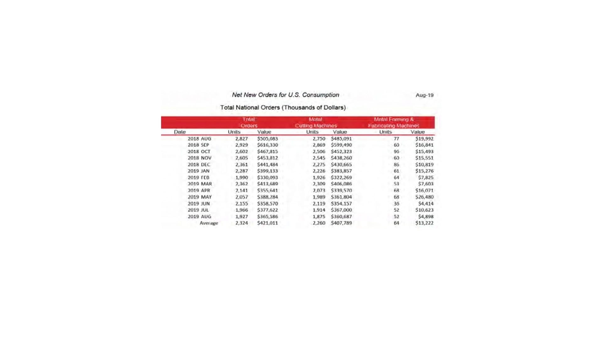 Orders for 2019 totaled just under $3 billion, a decline of 14.4 percent from the 2018 total to date. Despite the decline over 2018, the total value of manufacturing technology orders in 2019 are the second highest annual total through August since 2014.