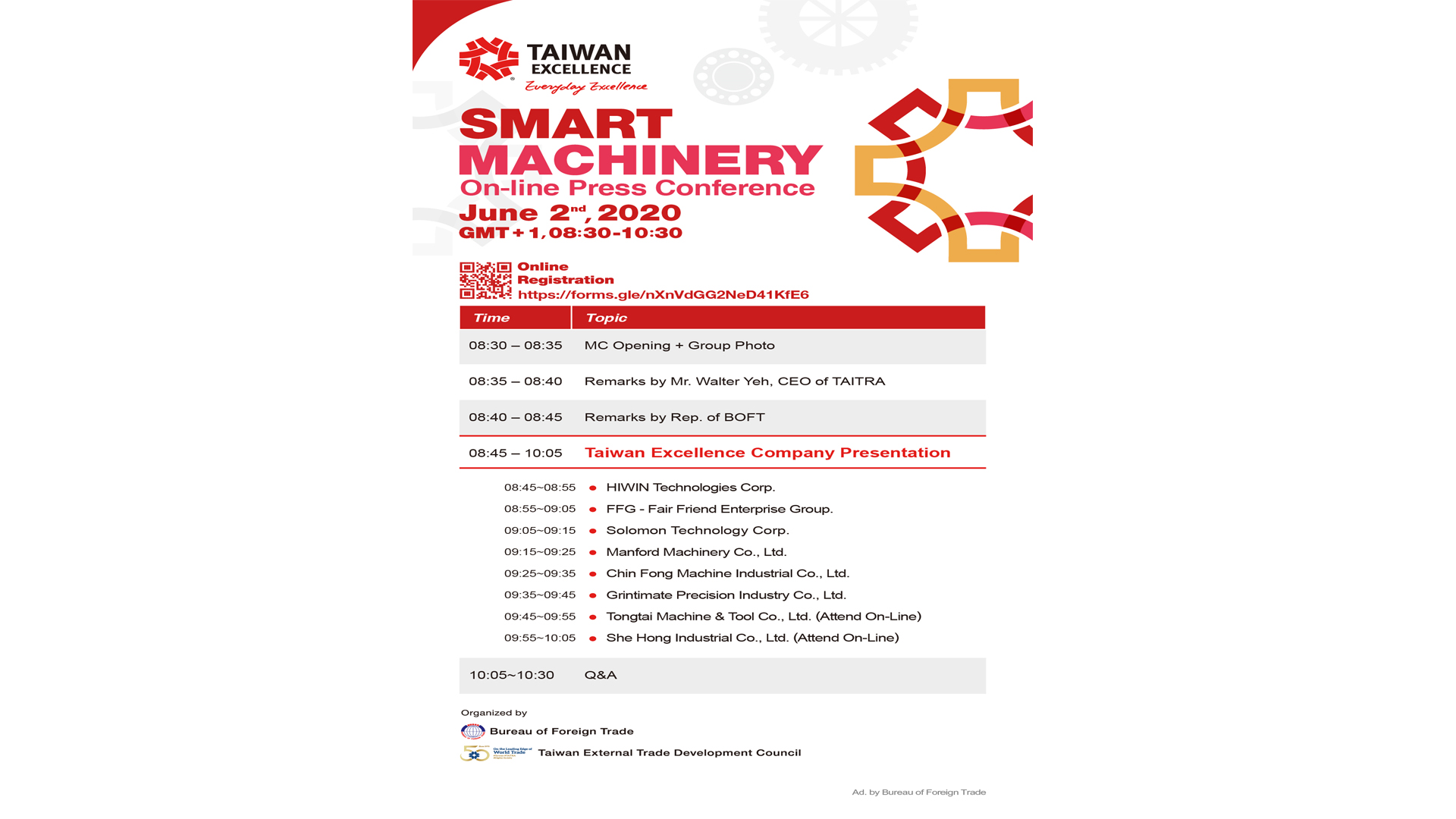 Taiwan Excellence, an international campaign to promote Taiwan’s superior products, will host the ‘Taiwan Excellence Smart Machinery’ On-Line Press Conference on June 2, from 8:30am to 10:30am. To assist global manufacturers in arranging industry upgrade and automation, Taiwan Excellence has invited eight of Taiwan’s most iconic smart machinery companies to showcase their most advanced smart manufacturing solutions.