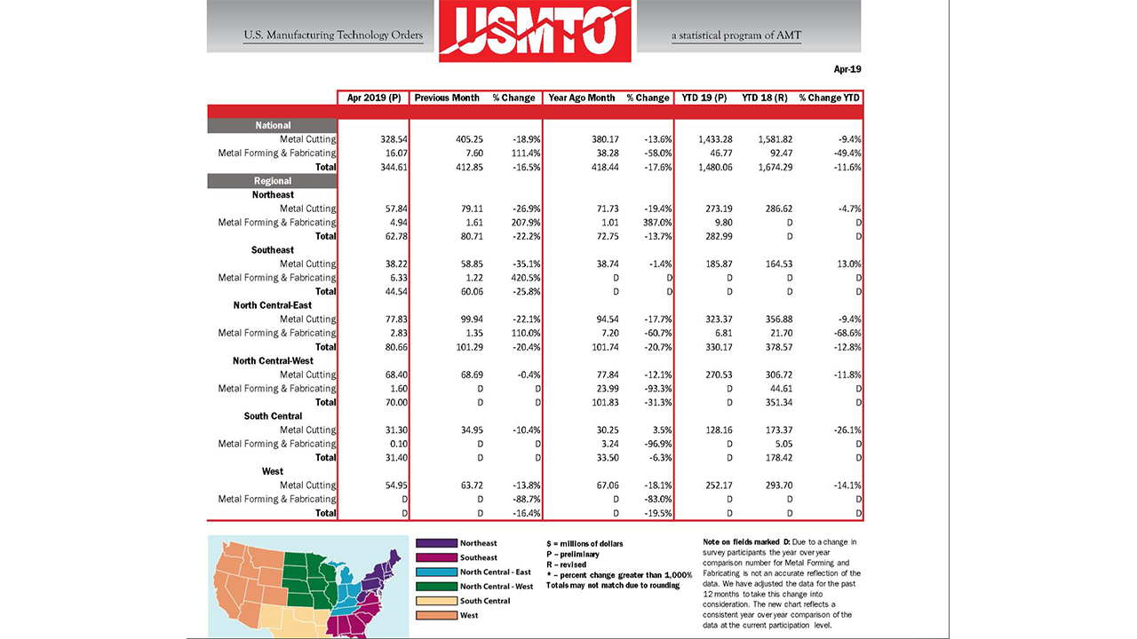 McLean, VA (June 10, 2019) – U.S. manufacturing technology orders totaled $344.6 million in April 2019, the lowest April reading since 2016 when orders totaled $293.2 million. April 2019 orders declined 16.5 percent from March 2019 and were down 17.6 percent from April 2018, according to the latest U.S. Manufacturing Technology Orders Report published by AMT – The Association For Manufacturing Technology. Orders totaled $1.48 billion in the first third of 2019, 11.6 percent short of this point in 2018.