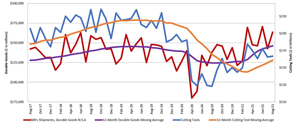 Pat McGibbon, chief knowledge officer of AMT, commented, “We think the outlook for cutting tools is bright. Cutting tool shipments’ year-over-year moving average has been 24% over the past four months, and machine tool orders are up 48% year-to-date from 2020 levels. We see the severe difference in growth rates between consumables and equipment as a reflection of the challenge downstream customers are having in securing materials and parts to machines. It is just a matter of time before these bottlenecks break loose.”